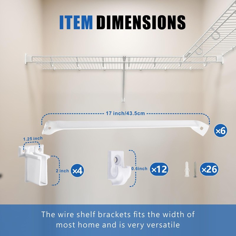 - Suitable Size: The bracket is approximately 17.5'' long, for supporting 12-inch wire shelves. The closet bracket supports the wire shelf into a stable triangular structure, ensuring your wire shelf is sturdy enough and resistant to sagging