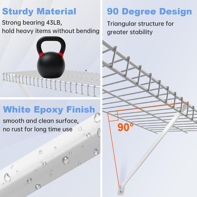 - **Premium Heavy-Duty Construction** – Made from high-quality epoxy-coated steel, these wire shelf brackets offer exceptional strength and durability, supporting heavy loads without bending or warping for long-lasting use.