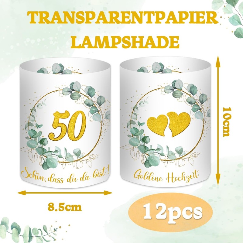 - High-quality material: the 12 lanterns are made of high-quality film and made with soy print colour. Important note: no candle, no tea lights; the lantern is not made of glass, does not contain glass, is very light and not suitable for outdoor use). Motif: "50", "Golden Wedding Anniversary" Love, Eucalyptus Leaves. Size unfolded: 27 x 10 cm, folded: 8.5 x 10 cm.