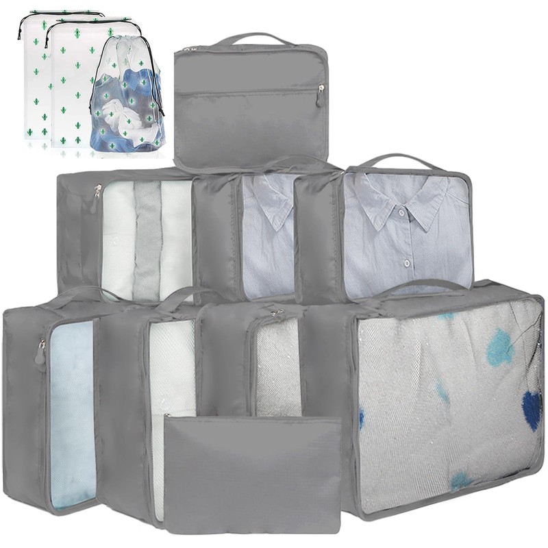 12 Large/Medium/Small Packing Cubes – Luggage Organiser in Various Sizes – Mesh Travel Packing Cube Set in Assorted Colours (12 Grey Mixed Sizes)