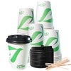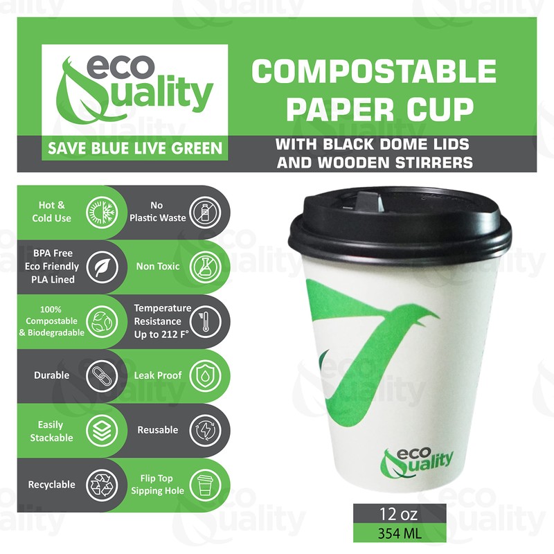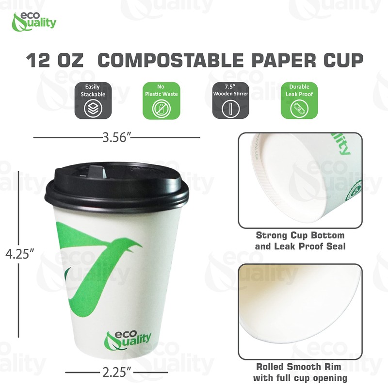 12 oz Compostable Paper Cups with Black Dome Lids and Wooden Stirrers - Biodegradable Disposable White Paper Coffee Cups PLA Lined - Eco-friendly Hot and Cold Drinking Cups (1000)