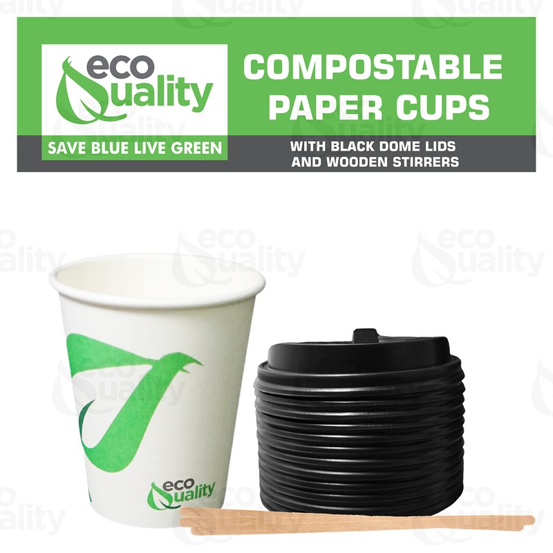 12 oz White Paper Compostable Biodegradable Paper Cups with Black Dome Lids and Wooden Stirrer Sticks