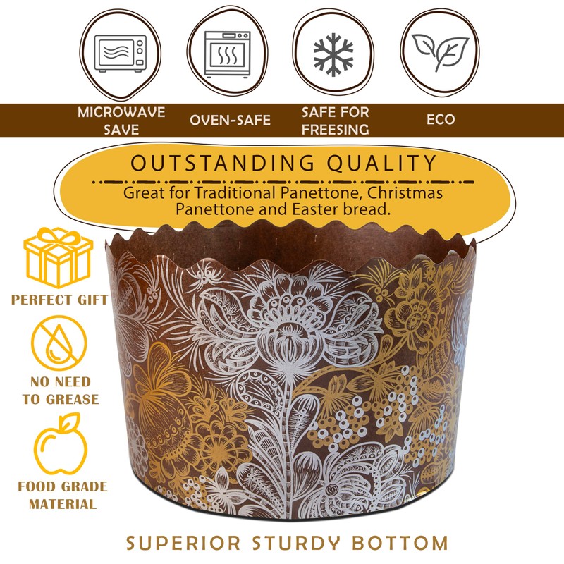 - Paper Design : Golden-bird brown color W 4.33 x H 3.35-Inсhes, 350 gr, 12 oz. Design is random. Pack of 12 panettone disposable paper baking molds