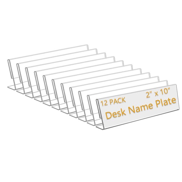 12 Pack 10"W x 2"H Acrylic Office Name Plates Name Labels for Desks, Horizontal Slant Back Clear Desk Sign Holder for Table Display
