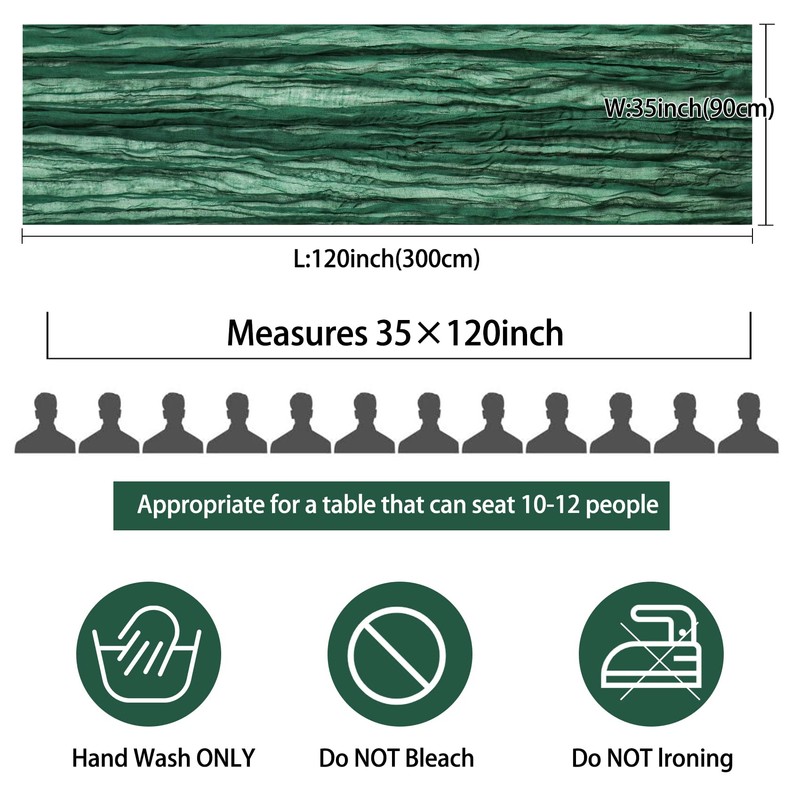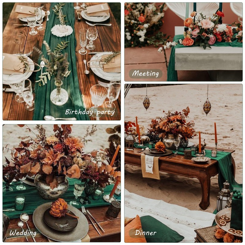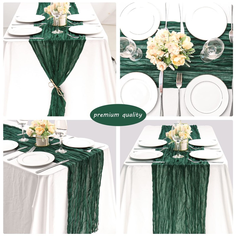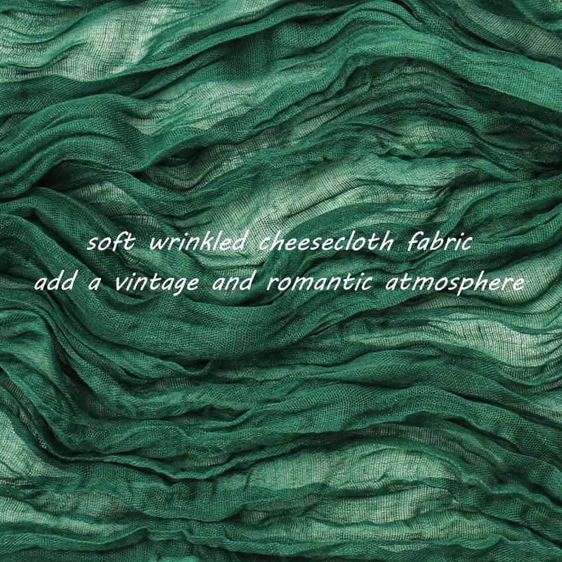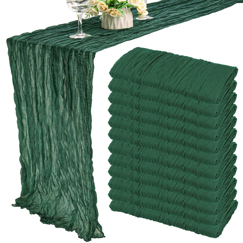 - Package Include: you will get 12 pieces 10ft length dark green cheesecloth table runner, enough quantity is suitable for wedding banquets and various parties, the size of each table runner is approximately 35 x 120 inches / 90 x 300 cm, which is large enough to cover rectangle and round tables, can also be spliced together for long tables. Even can be used for chair cover sashes or decorative napkins, backdrop draping or even gift wrapping.