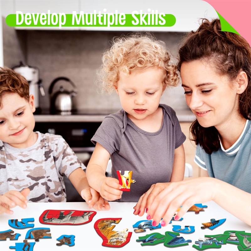 Step by Step Puzzles: The puzzles are divided into 3 colors for different difficulties, 3-piece puzzles in green, 4-piece puzzles in red, 5-piece puzzles in blue. Kids could easily start with the ones with less pieces and then try the harder ones. On the back, there are corresponding animal name as guiding, so kids could get some help to finish the puzzles all by themselves.