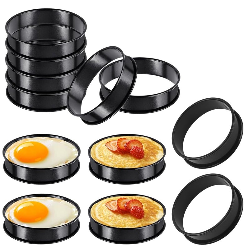 The 12-pack of 10cm black metal egg rings is a must-have for home cooks and chefs who want perfectly round, evenly cooked food. Made from durable steel (each ring weighs 22g), these rings can be used over and over on the stovetop, in a frying pan, or in the oven.