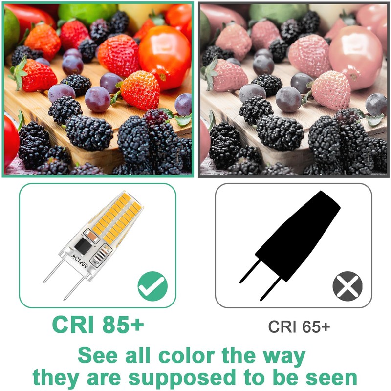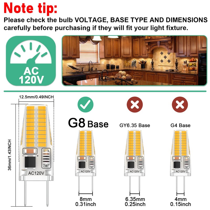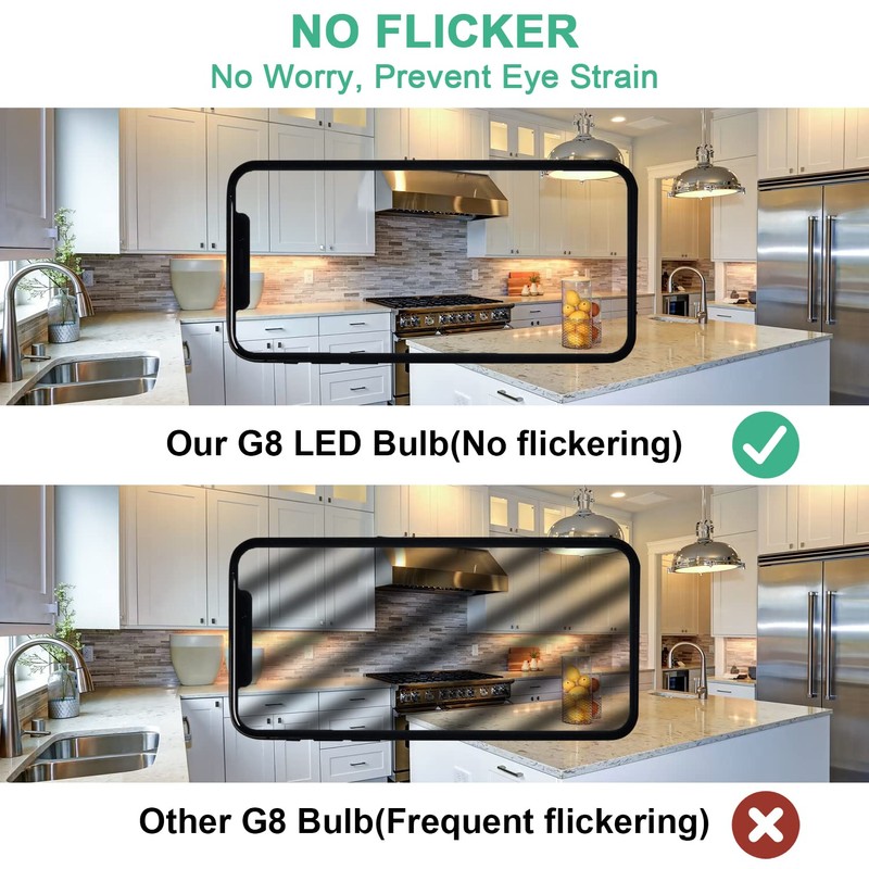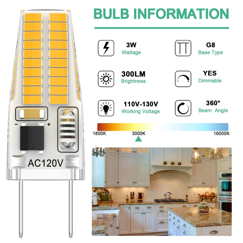 - 【G8 LED Dimmable Bulb】Works well with most LED dimmers, no flickering or buzzing on dim. 85Ra CRI, warm white 3000k, providing you with 360 degree bright and comfortable lighting.