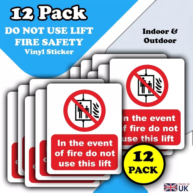 12-Pack in The Event of Fire Do Not Use This Lift Vinyl Sticker Notice Signs - Water/Weather Proof/Long Lasting
