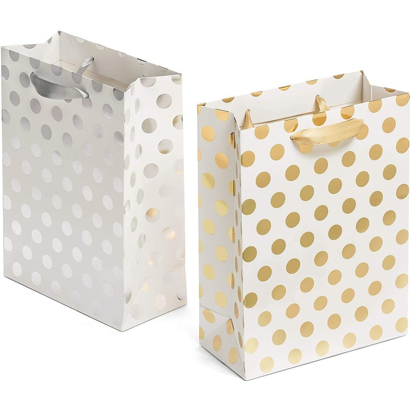 12 Pack - Medium Sized Gift Bags Set with Ribbon Handles - 12 Gold or Silver Polka Dot Bags Perfect for Weddings, Birthday and Holiday Presents 30x25x10 cm (silver)