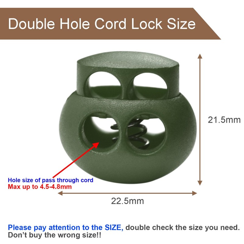 - Cord Locks Item:12 Pack plastic spring cord locks fastener,outter Size : 22.5 x 21.5 mm ,hole Dia. 6 mm,fit a variety of different drawstrings paracrod and types of cords less than 6mm.Rope is not included in the Cord Lock department