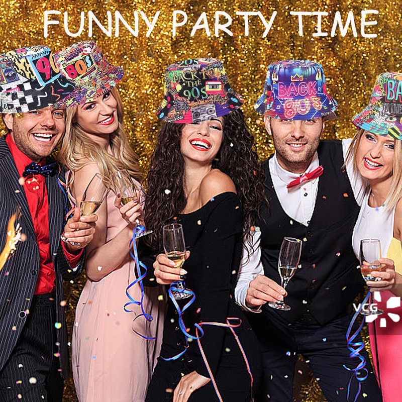 - 【Fun and Cool Photo Booth Props】The classic 80s 90s fisherman bucket hats paired with 80s 90s party glasses adds a huge hit color to your retro party. It is a cool photo booth props set for men, women, and of all ages.