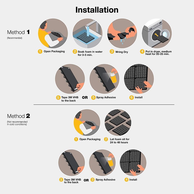 - [EXPANDS QUICKLY]: Our sound proof foam panels come compressed in a vacuum package and quickly recover to normal size, either by placing in a well ventilated place for about 24-48 hours or soaking the sound foam in water for one minute then wringing the water out and using a hair dryer or letting it air/sun dry.