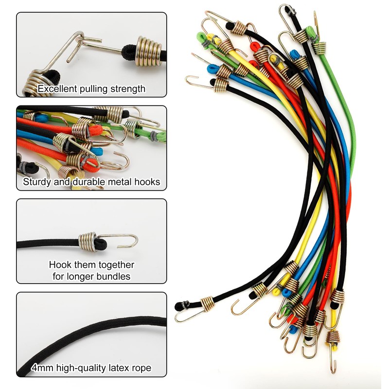 - [Complete Set & Value] Includes 12 durable bungee cords (2 orange, 2 yellow, 2 green, 2 blue, and 4 black) to meet all your bundling and securing needs. A practical and thoughtful gift for any occasion.