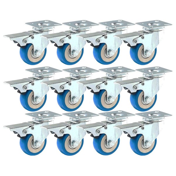 12 Pack with Brake Caster Wheels Swivel Plate Casters On Blue Polyurethane Wheels PU