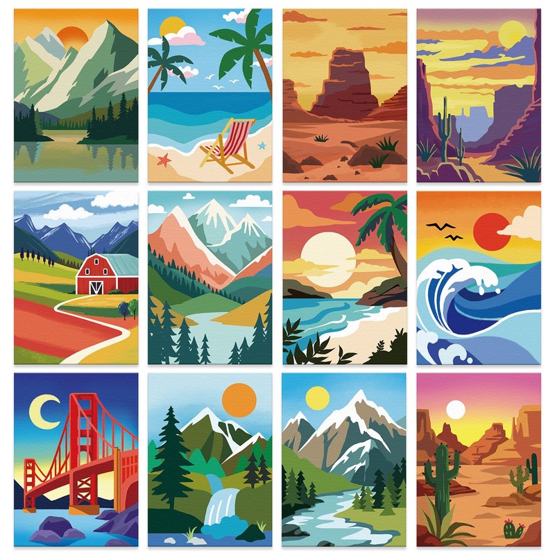 12 Packs Pre Drawn Canvas to Paint for Adults, Pre Printed Canvas for Kids, Pre Stretched Canvas Outline Painting Boards for Beginners, Students, Party Favor (5 * 7 inch, Landscape)