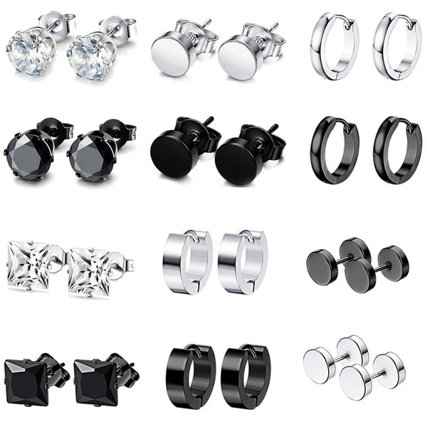 12 Pairs Earrings For Men Women Stainless Steel,Round Earring Men Punk Punk Ear Studs, Jewelry Black Kpop Stylish Punk Goth Piercing Earrings,Hypoallergenic