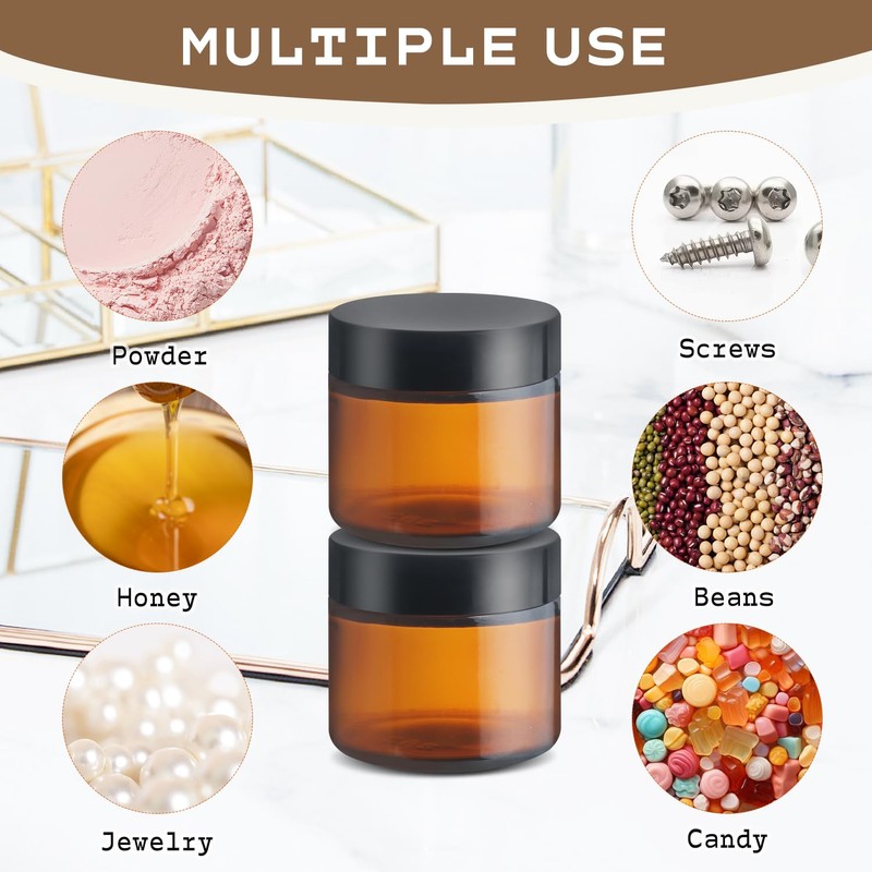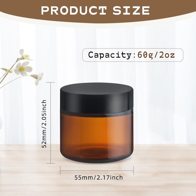 12 Pcs 60g/2oz Amber Glass Jars Empty Cosmetic Containers with Plastic Black Lids for Body Cream Lotion Spice Powder Liquid Sample