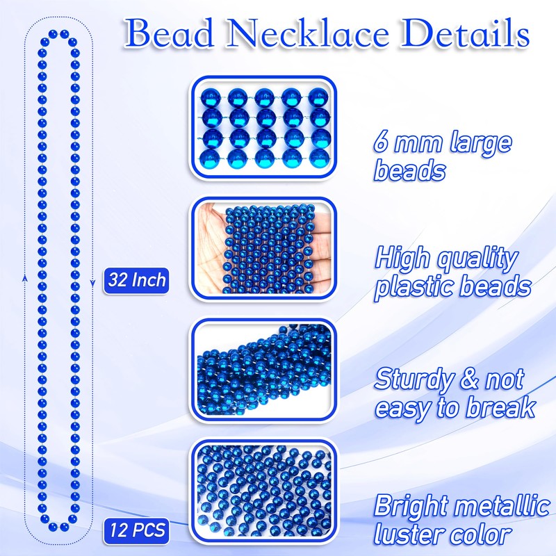 12 PCS Bead Necklaces, Blue Mardi Gras Beads, Metallic Plastic Beaded Necklaces, 32" Parade Throws Party Supplies Party Accessories Decor for Gender Passover Hanukkah Christmas Carnival Birthday