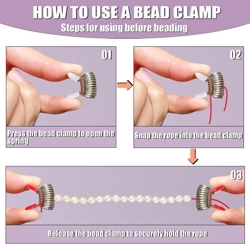 - Easy to Use: Simply clamp the spring clips clamps onto the cord, and it will securely hold the beads in place, preventing them from falling off; And simply pass the rope through the small hole in the center of the Bead Knotting Tool, tie a knot, wrap the rope a few times around the knot gripper, then pull firmly until the knot is tightened; This bracelet tightening tool reduces friction and pressure on your hands during use, avoid blisters or fatigue