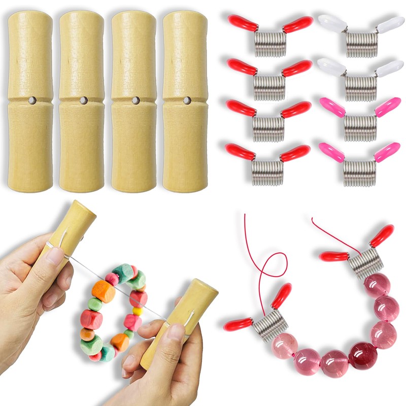 12 Pcs Beading Tools, Include 8 Pcs Spring Clamps for Jewelry Making, Bead Stopper with Handles to Prevent Beads from Falling, and 4 Pcs Wooden Tightening Knot Grippers Tool for Silicone Beads
