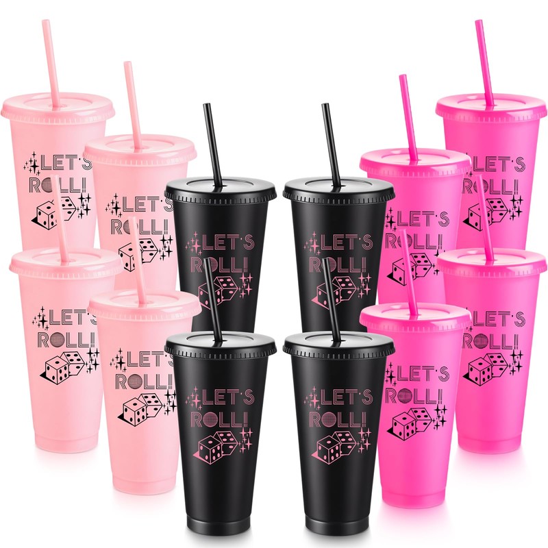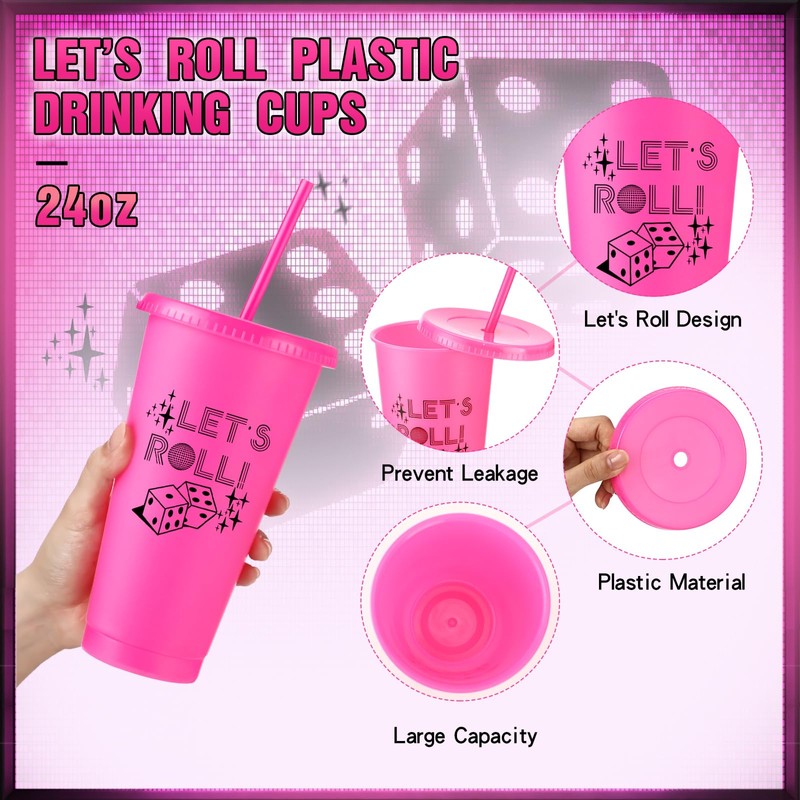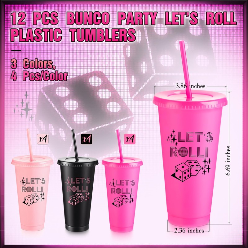 12 Pcs Bunco Party Supplies Bulk 24oz Let's Roll Dice Plastic Tumblers Bunco Cups with Lids and Straws Reusable Girls Weekend Cups Gifts for Women Game Night Casino Party Wedding Sleepover Slumber