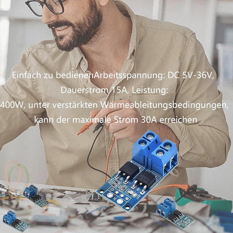 - Working voltage: the MOS transistor driver control module uses two parallel MOS active output to display lower internal resistance, larger current and higher power DC 5V-36V, continuous current: 15A, power: 400W and improves heat dissipation conditions, with a maximum current of up to 30A