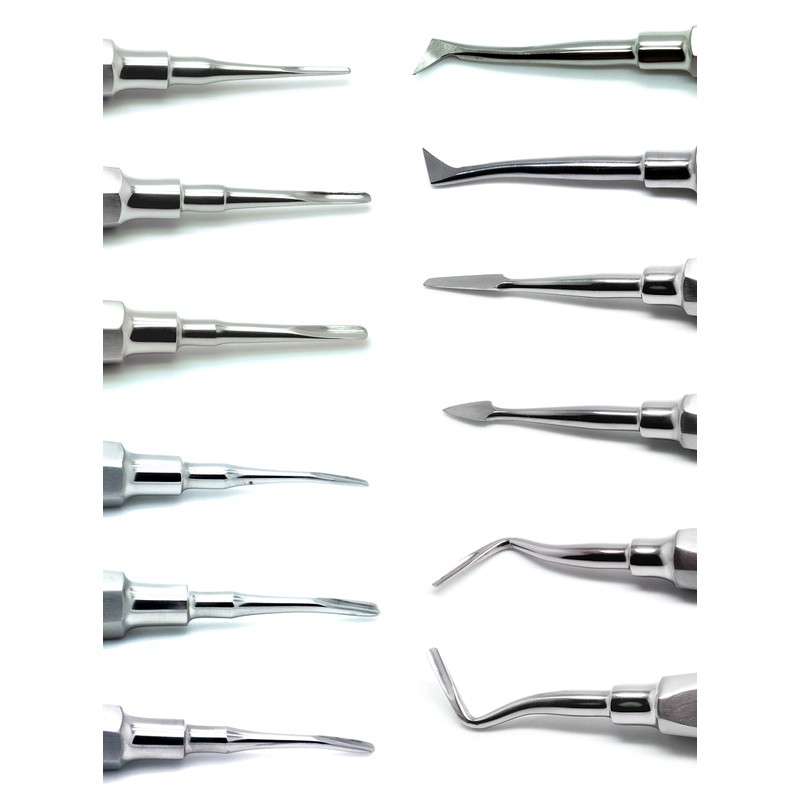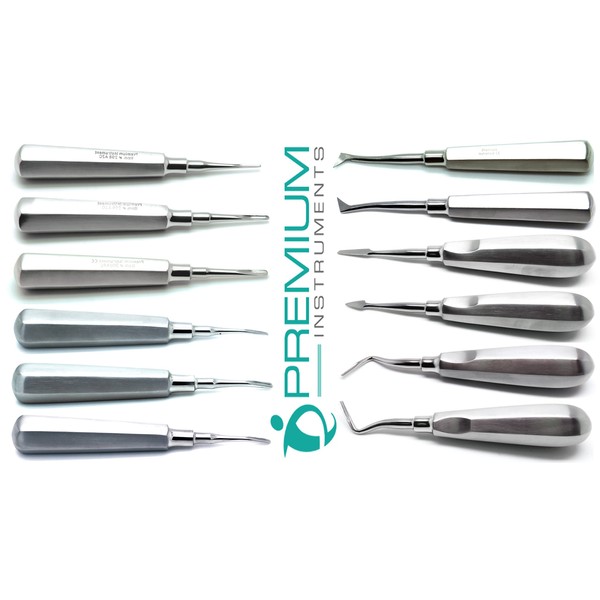 12 Pieces Set Includes: (1)… Curved Elevator 2mm (2)… Curved Elevator 3mm (3)… Curved Elevator 4mm (4)… Straight Elevator 2mm (5)… Straight Elevator 3mm (6)… Straight Elevator 4mm (7)… Cryer Left # 27 (8)… Cryer Right # 28. (9)... Cogswell A Root Elevator Straight. (10)... Dental Spear Root Elevator # 36. (11)... Apical Elevator Del # 303. (12)... Apical Elevator Del # 302. Elevators are designed to make extractions as trauma free as possible by cutting the periodontal ligament while easing the tooth from the socket. The result is less tissue damage that promotes quicker healing and fewer complications. The Premium Instruments Elevator is used by rocking and cutting rather than by lifting and prying the way a conventional elevator is used. Luxating elevators have thin, sharp blades that are used to cut periodontal ligaments. The luxating elevator is used by rocking and cutting vs. an elevator that lifts and pries. Luxating elevators reduce putting pressure on adjacent teeth. One-Piece Stainless Steel Construction Tip will not separate from handle. Provides strength and durability.