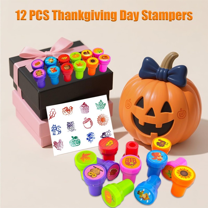 12 Pcs Fall Harvest Thanksgiving Print Stamp Set Self Inking Thanksgiving Pumpkin Turkey Stampers DIY Painting Festive Toy Stamps Gift Party Favors