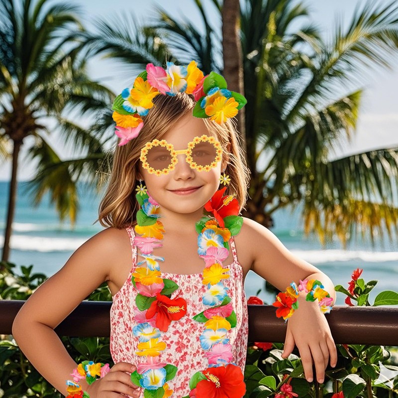 High quality material, comfortable and durable: The garland is made of brightly coloured imitation flowers, not easy to fade, with elastic rope design, freely adjustable elasticity, comfortable to wear. The earrings and glasses are made of smooth and safy PP material, which is safe and skin-friendly, especially suitable for children to wear, and can be used repeatedly and treasured for a long time after the party!