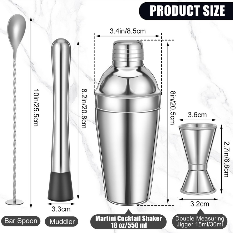 - Cocktail Shaker Set: the box contain 3 set 4- piece cocktail bartending tool, 3 pcs 18 oz martini shaker, 3 pcs 15+30ml double mearing jiggers, 3 T-shaped mixing spoons and 3 muddlers; Each set is packaged in a printed box, suitable for giving gifts