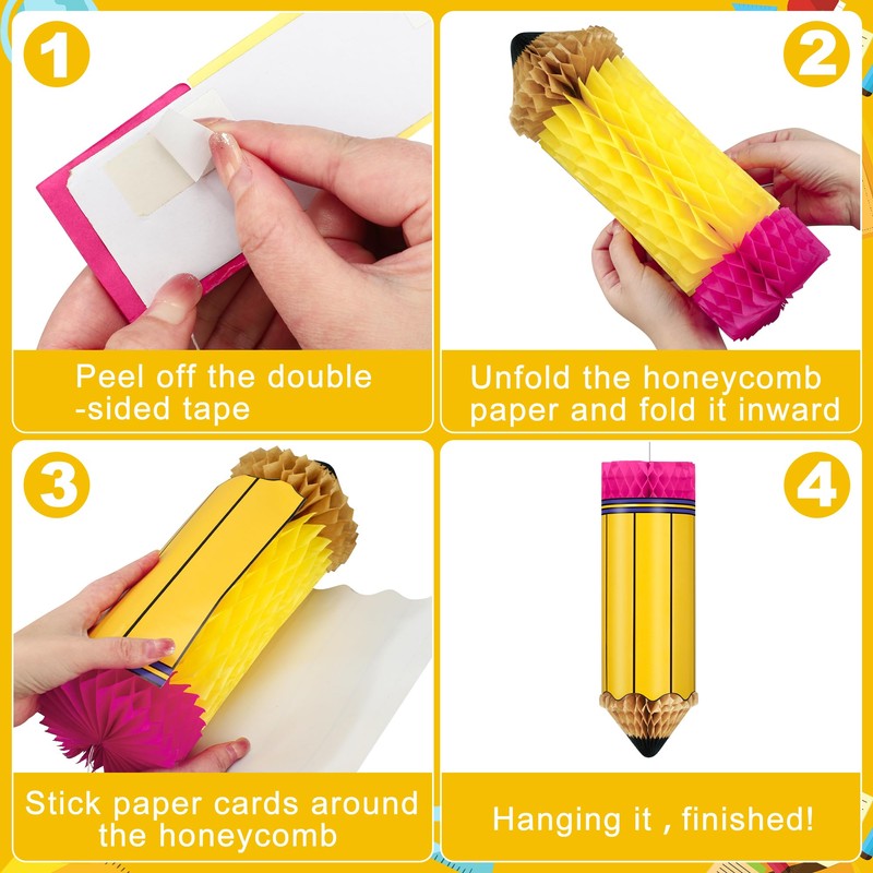 - Easy installation: the pencil back to school ceiling party decorations are easy to open and install, and can be applied to double-sided tape. Simply peel off the double sided tape on the back and glue them together, and a perfect pencil honeycomb is complete. You can easily hang the first day of school hanging honeycomb anywhere you want.
