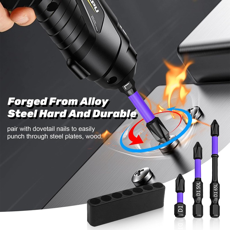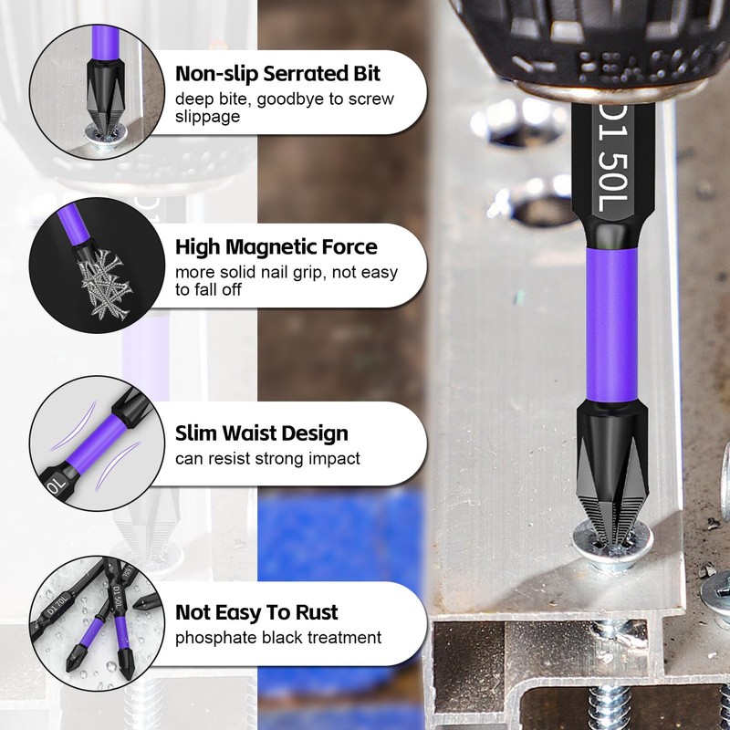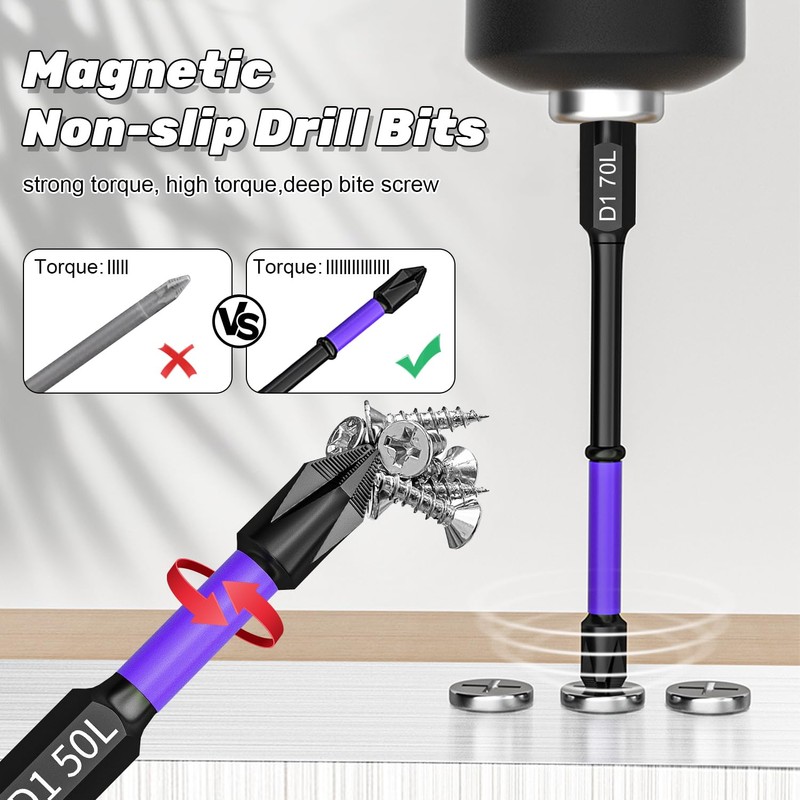 - Mechanical design: strong torque, after contact with the screw, the torque part absorbs the reaction force of the impact and effectively prevents the long bits set from breaking the head. Delicate and thin waist design, the buffer zone makes the bit has good impact resistance.