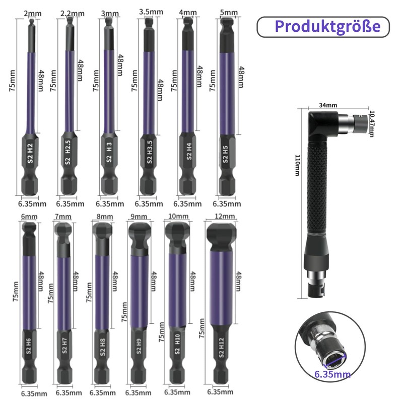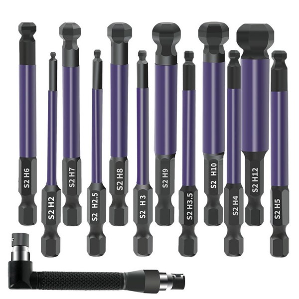 12-piece screwdriver set, hexagonal bit set, ball head, hexagon screwdriver bit, 75 mm, 1/4 inch, magnetic hexagon socket impact wrench bits set, 2/2.5/3/4/5/6/8/10/12 mm, S2 bit set