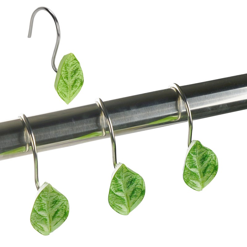 - SET CONTENT: Set of 12 green botanical leaf shower curtain hooks. Stainless steel hooks. Leaf parts are made of resin.
