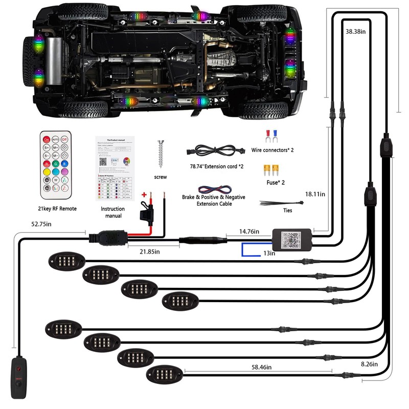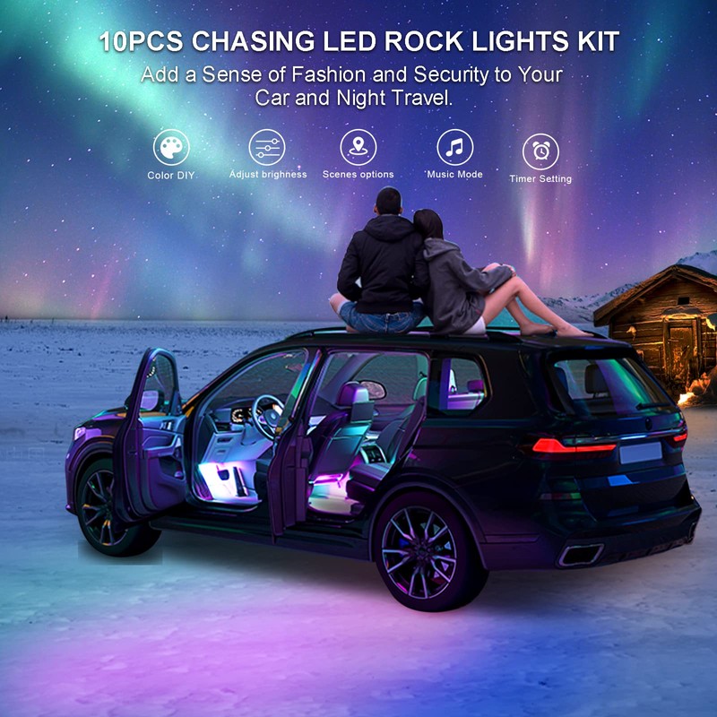 - COMPATIBILITY: The truck RGB chasing rock lights are compatible with all 12V DC vehicles; It is convenient to install with double sided tap; With extra long wires to fit more car sizes; Underglow neon light kits are perfect for truck, off road, truck, UTV, ATV, SUV, RZR, RV, boat, car, pickup, golf cart, van, motorcycle; You can install it on tires, wheels, fenders, front grille, under or outside of the car