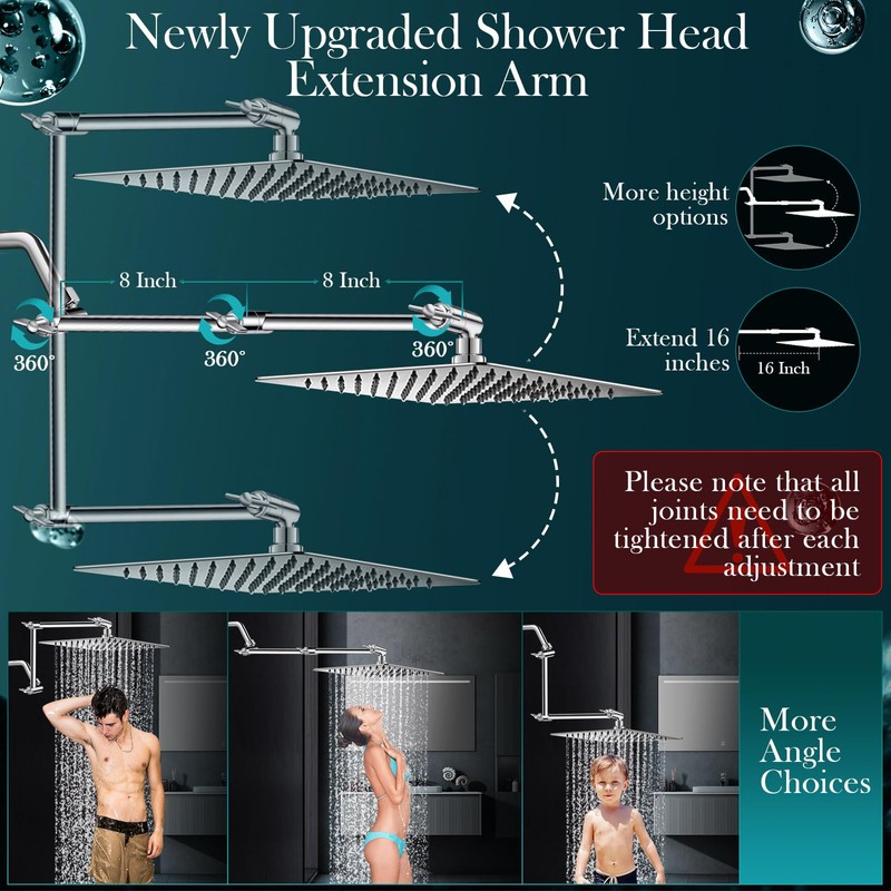 - 16 Inch Upgraded Shower Extension Arm : Newly upgraded 16 "extension arm avoids the hassle of getting too close to the wall in the shower. The tight link and setting screws greatly improve the load-bearing capacity of the extension arm. The dual adjustment offers a variety of Angle options, up to 15.47 inches up or down, providing a great vertical shower while catering to a family's height requirements.