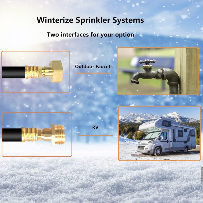 - 【Application】 Winterize blowout adapter is applied to winterize garden water pipes, sprinkler systems, by blowing out water from the water lines/plumbing, significantly reduce applications of antifreeze, very convenient, safe, healthy, environment friendly. Flexible hose allows the adapter to access tight spaces and minimizes stress on pipes and fittings.
