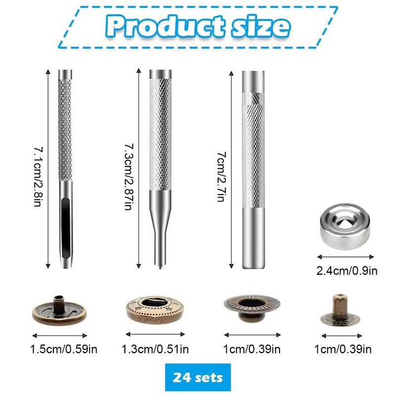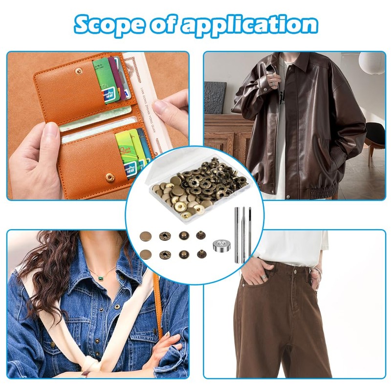 - Complete Set for Convenience:Each kit includes 12 pairs of 15mm metal snap buttons, complete with caps, washers, sockets, studs, and 4 installation tools. The set is neatly packed in a transparent box for easy storage and organization