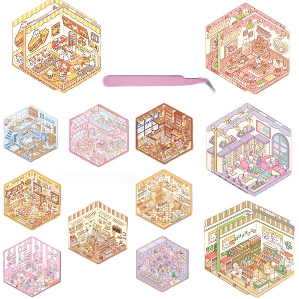 12 Sets DIY 3D Sticker Scene,DIY 3D House Stickers Make Your Own Warm Home,Supermarket,Coffee Shop,Hamburg,Library 3D Cartoon Scene Sticker for Kids Therapy for Adult Relief Stress Pass The Time