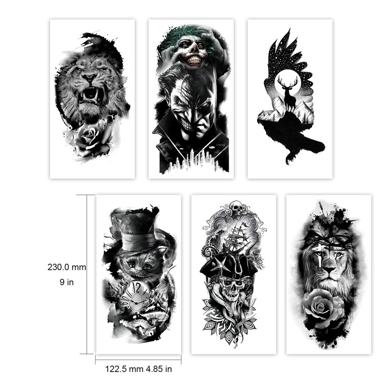 12 Sheets Half Large Temporary Tattoos Suitable for Adult Men Black Lion Cat Wolf Clock Pirate Fantasy Theme Design