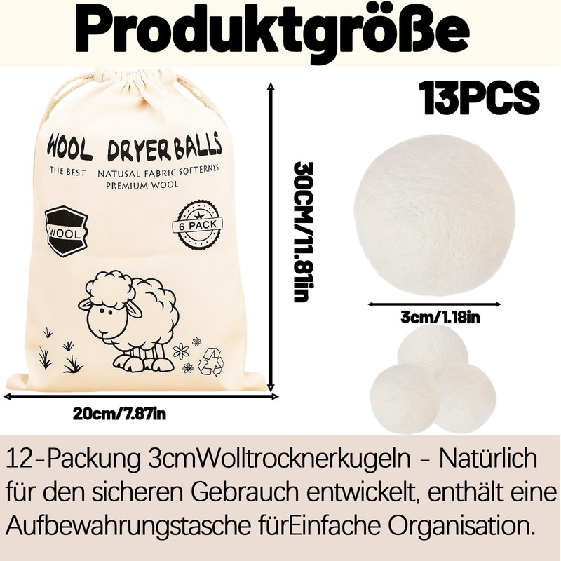 12 Stück Trocknerbälle für Wäschetrockner, 1,2 zoll/3cm Trocknerbälle für Daunenjacken Nehmen Sie eine Beutel mit, Wiederverwendbar, Wäsche zu Reduzieren Trocknungszeit, Verringern Falten und Tangle Praktische Größe & Aufbewahrung: Mit einem 12 stück Durchmesser von 3 cm bieten unsere trocknerbälle für wäschetrockner die perfekte Größe. Inklusive Aufbewahrungstasche für eine einfache Organisation und Aufbewahrung der Trocknerbälle.  Hochwertige Qualität: Diese trocknerbälle für daunenjacken werden aus Hochwertige Materialien und sind frei von Füllstoffen, Chemikalien oder Synthetik. Sie eignen sich zum Trocknen von Kleidung und Bettzeug und sind ideal für Menschen mit empfindlicher Haut, da sie sanft und hypoallergen sind.  Effizient & Sanft: Erleben Sie Wäsche, die sanft und weich ist-mit weniger Falten und ohne statische Aufladung. Unsere trocknerbälle für wäschetrockner sind ideal für empfindliche Baby-und Kinderkleidung und bieten Allergikern ein neues Maß an Komfort.  Sanfte Wäschetrocknung: Die trocknerbälle daunen reduzieren Knitterbildung und verkürzen die Trocknungszeit; Ideal für empfindliche Textilien wie Daunenjacken und Pullover; Die Trocknerbälle für Daunenjacken schonen Fasern und erhalten die Form der Kleidung.  Tolle Geschenkidee: Diese trocknerbälle für wäschetrockner sind ein ideales Geschenk für frischgebackene Mütter und Menschen mit empfindlicher Haut. Sie sind auch ein durchdachtes Geschenk für Einweihungen und perfekt für alle, die Wert auf einen grünen und nachhaltigen Lebensstil legen.