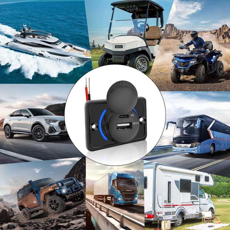 12 V USB Socket, Dual USB C Charging Socket 12 V Car Charger QC3.0 & PD USB C Car Quick Charging Socket Waterproof for 12 V / 24 V Motorhome Motorcycle Truck Boat