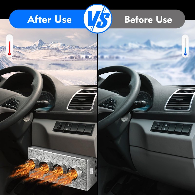 - Excellent Performance: This car heater has a high heat conversion rate and can heat your interior space in real time. The 12 thick copper pipes can quickly heat the air passing through in a short period. The powerful pure-copper turbo dual-wheel motor and 4-hole air outlet provide strong warm air