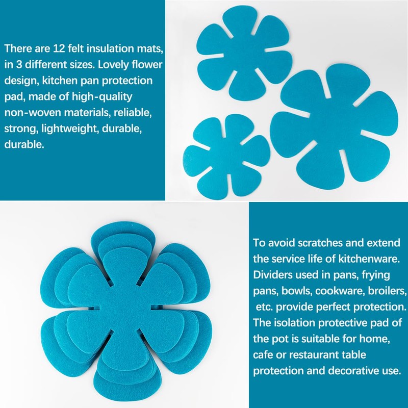 • COMPLETE SET Our set includes 12 pieces pan protectors in three different sizes - 8/10/10/12 inches, each size comes with three parts, which are suitable for a wide range of cookware, glassware and bowls, perfect for most households and provide full protection for your cookware.