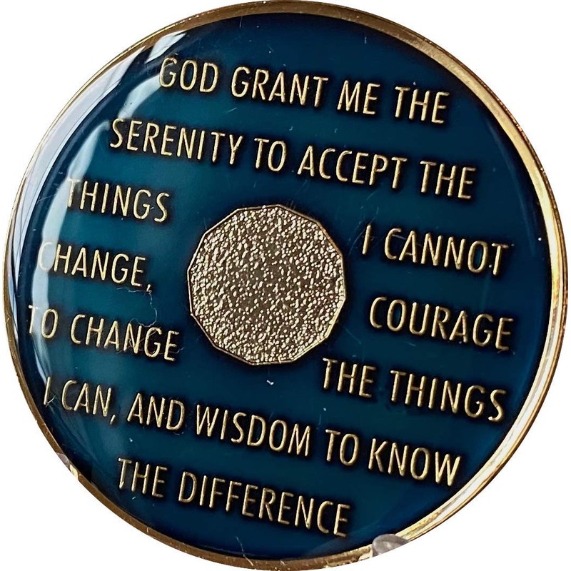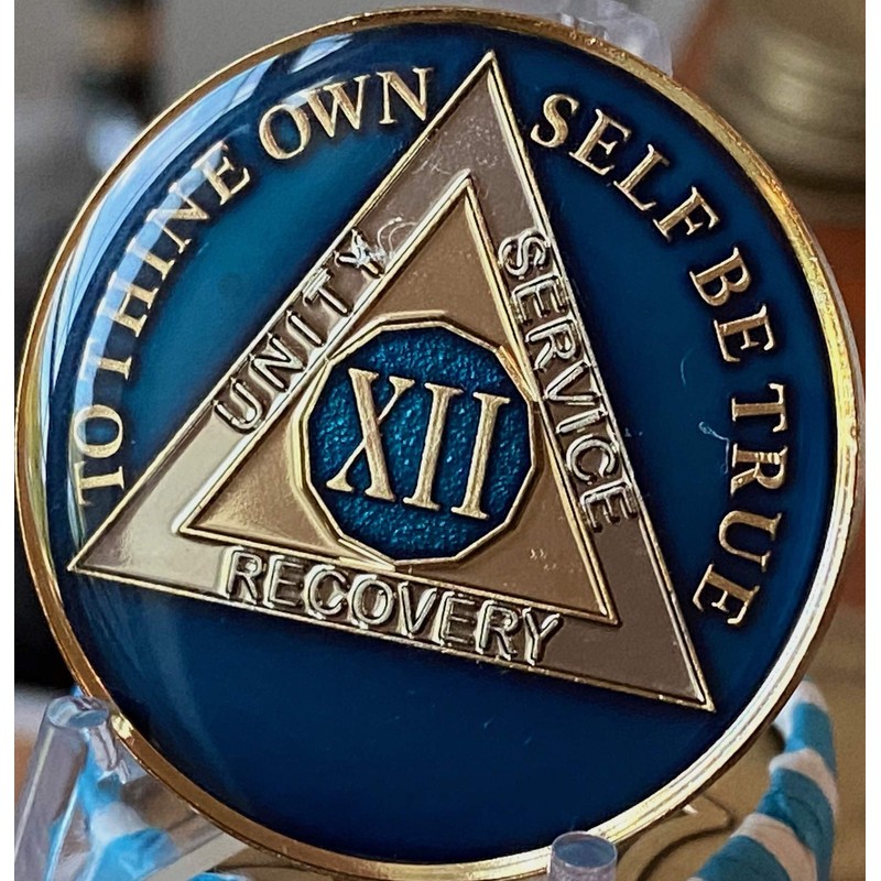 12 Year AA Medallion Metallic Midnight Blue Tri-Plate Sobriety Chip Serenity Prayer Back XII