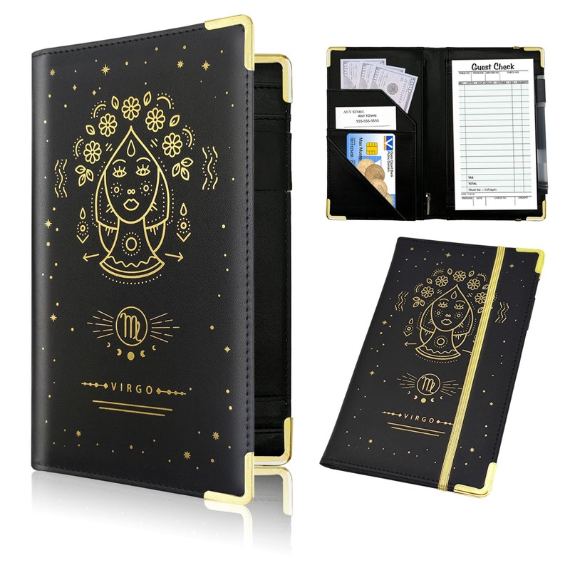 12 Zodiac Signs Server Book, Black Libra Server Books for Waitress Cute, Waiter Receipt Book, PU Leather Waitress Book with Zipper Pocket, Waitress Accessories(Virgo)