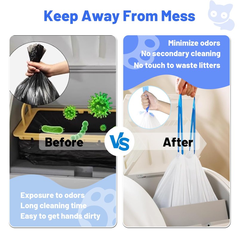 • Keep Clean: The litter box liner are designed for easy disposal. Once the bag is full, you can simply tie it up, seal it, and dispose of it in the trash without direct contact with the waste. Using a cat litter bag helps contain the litter within the automatic litter box self cleaning bag, preventing it from spreading around the litter box area, making changing the litter a breeze. This can help maintain a fresher and more pleasant environment in your home
