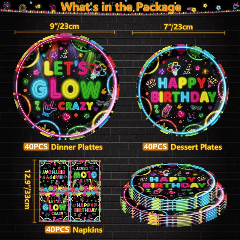 - Glow Neon Party Supplies Included: 40 X 9” dinner plates, 40 X 7” dessert plates, 40 X napkins. You will receive 120 pack for neon birthday party decorations. Sufficient quantity and bright colors can meet your needs and replacement. They can be applied to adorn your neon theme party table, creating a party atmosphere.