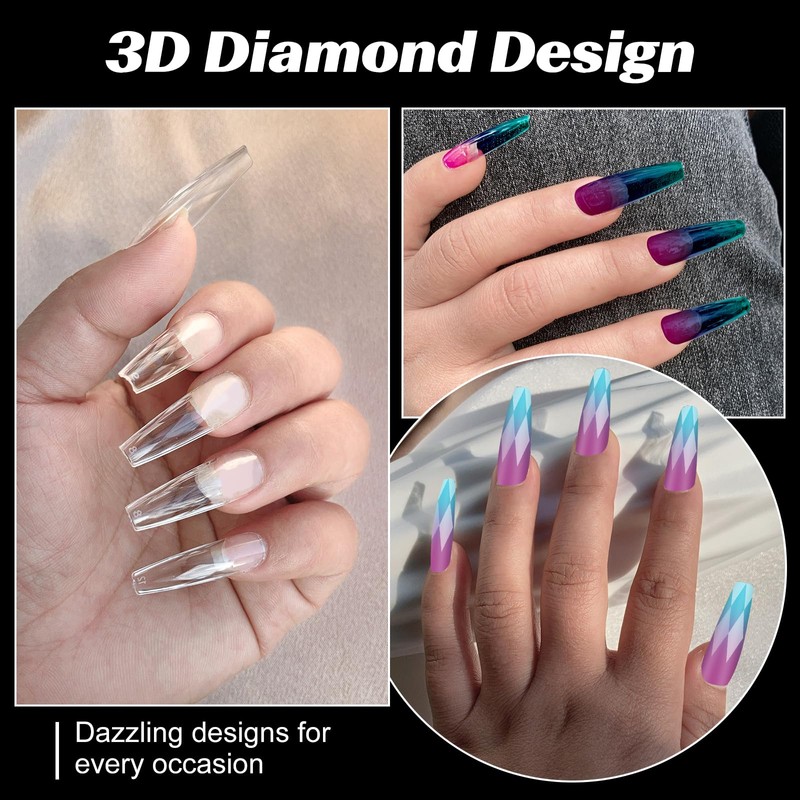 120 Pcs Coffin Nail Tips, ZAHRVIA Clear Extra Long Coffin Nail Tips, 3D Diamond Shape Designs Soft Gel Tip Full Cover Acrylic Nail Tips, 15 Sizes Suitable for Nail Tips Art Salons and Home DIY